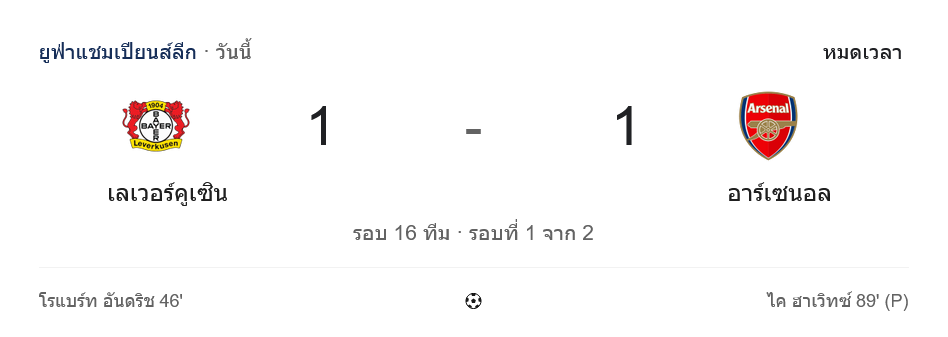 ศึก ยูฟ่า แชมเปี้ยนส์ ลีก รอบ 16 ทีม นัดแรก จบลงแบบเดือดสมราคา เมื่อเลเวอร์คูเซ่นเปิดบ้านเสมออาร์เซนอล 1-1 โดยเจ้าถิ่นขึ้นนำก่อนจาก โรเบิร์ต อันดริช ต้นครึ่งหลัง ก่อนที่ ไค ฮาแวร์ตซ์ จะยิงจุดโทษช่วยอาร์เซนอลตีเสมอช่วงท้าย ทำให้ ผลบอลสด คู่นี้ยังเปิดกว้างเต็มที่ก่อนยกสอง