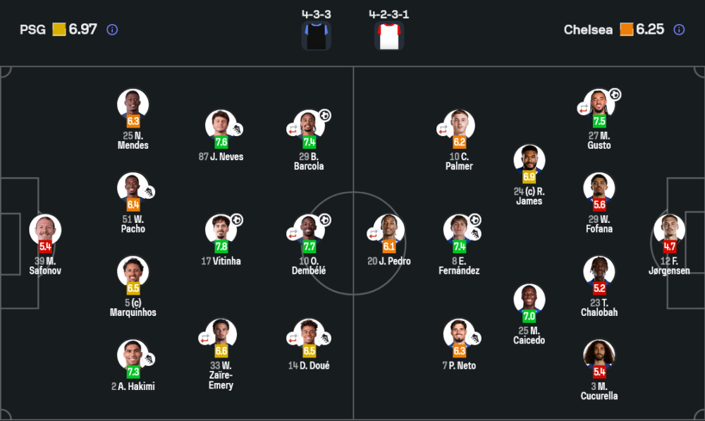 ควิชา ควารัตสเคเลีย คือจุดเปลี่ยนของเกมอย่างแท้จริง หลังลงสนามนาที 62 เขาจัดไป 2 ประตู 1 แอสซิสต์ พร้อมคะแนนสูงสุด 9.2 พลิกเกมจากที่ยังสูสีให้กลายเป็นคืนของเปแอสเชแบบเต็มตัว ทุกครั้งที่ได้บอลเขาสร้างปัญหาให้แนวรับเชลซี และเป็นตัวตัดสินเกมที่แท้จริง
