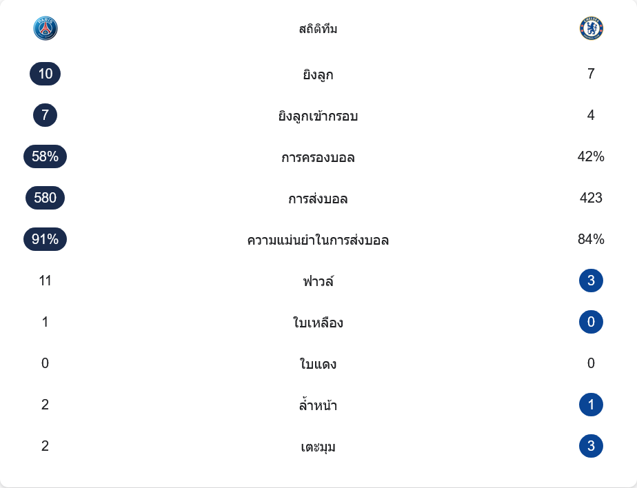 เกมนี้เปแอสเชครองบอล 58 เปอร์เซ็นต์ เหนือกว่าเชลซีที่มี 42 เปอร์เซ็นต์ พร้อมจำนวนการผ่านบอล 580 ครั้ง และความแม่นยำ 91 เปอร์เซ็นต์ ขณะที่เชลซีผ่านบอล 423 ครั้ง แม่นยำ 84 เปอร์เซ็นต์ ด้านโอกาสจบสกอร์ เปแอสเชยิง 10 ครั้ง เข้ากรอบ 7 ครั้ง ส่วนเชลซียิง 7 ครั้ง เข้ากรอบ 4 ครั้ง ตัวเลขเหล่านี้ชี้ชัดว่าเจ้าบ้านไม่ได้เหนือกว่าทุกด้าน แต่เด็ดขาดกว่าอย่างชัดเจนในจังหวะสุดท้าย จึงเปลี่ยนเกมสูสีให้กลายเป็นชัยชนะขาดลอย