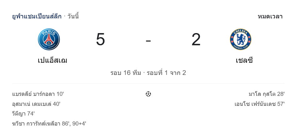 ศึก ยูฟ่า แชมเปี้ยนส์ ลีก รอบ 16 ทีม นัดแรก เกมนี้เล่นกันดุเดือดตั้งแต่ต้นจนจบ ก่อนที่ เปแอสเช จะเปิดบ้านอัด เชลซี 5-2 แบบสะใจแฟนเจ้าถิ่น โดยเกมนี้แฟนบอลที่ตามลุ้น ผลบอลสด ได้เห็นครบทั้งจังหวะสวนกลับ เกมบุกแลกกัน และความเด็ดขาดในพื้นที่สุดท้ายที่ฝั่งปารีสเหนือกว่าชัดเจน