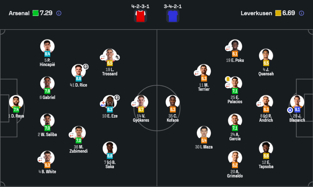 - กองหน้า: บูคาโย ซาก้า 8.8, เลอันโดร ทรอสซาร์ 6.5, วิคตอร์ โยเคเรส 6.7