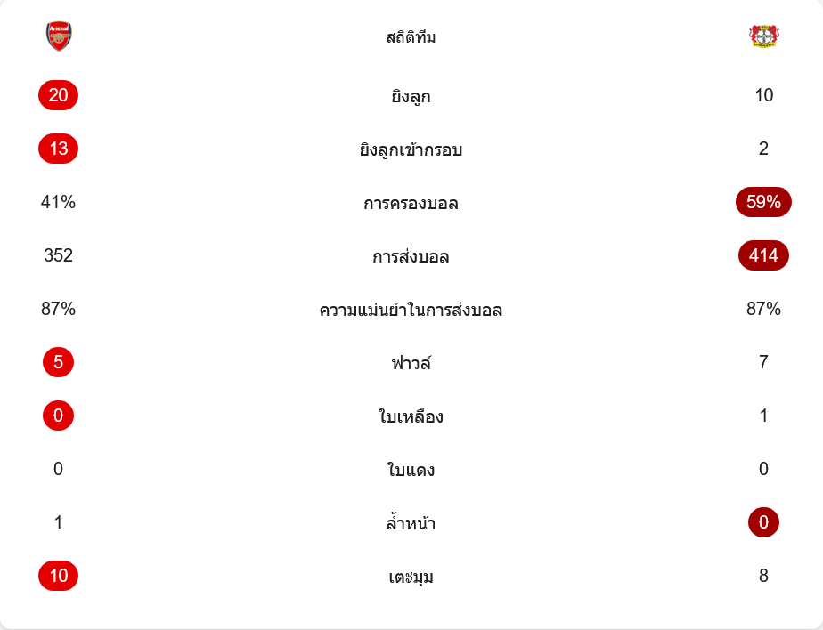 เกมนี้อาร์เซนอลยิง 20 ครั้ง เข้ากรอบ 13 ครั้ง ส่วนเลเวอร์คูเซ่นยิง 10 ครั้ง เข้ากรอบเพียง 2 ครั้ง แม้ทีมเยือนจะครองบอลมากกว่าที่ 59 เปอร์เซ็นต์ และจ่ายบอลมากกว่า 414 ต่อ 352 แต่ทั้งสองทีมมีความแม่นยำในการจ่ายบอลเท่ากันที่ 87 เปอร์เซ็นต์ อาร์เซนอลฟาวล์ 5 ครั้ง เลเวอร์คูเซ่น 7 ครั้ง ทีมเยือนได้ 1 ใบเหลือง ขณะที่เจ้าถิ่นไม่มีทั้งใบเหลืองและใบแดง และอาร์เซนอลยังได้เตะมุมมากกว่าที่ 10 ต่อ 8 สะท้อนชัดว่าเกมรุกของพวกเขากดดันได้หนักกว่า
