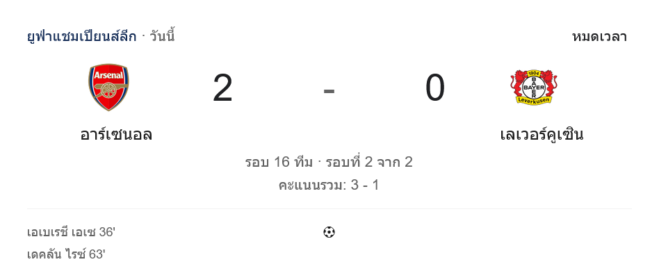 ศึก ยูฟ่า แชมเปี้ยนส์ ลีก รอบ 16 ทีม นัดที่สอง จบลงด้วยชัยชนะของอาร์เซนอลที่เปิดบ้านอัด ไบเออร์ เลเวอร์คูเซ่น 2-0 ส่งผลให้สกอร์รวมขยับเป็น 3-1 และนี่คือเกมที่แฟนบอลเช็ก ผลบอลสด แล้วต้องยอมรับว่า ปืนใหญ่เล่นได้เด็ดขาดกว่าเยอะ แม้ทีมเยือนจะครองบอลมากกว่า แต่ความอันตรายในพื้นที่สุดท้ายเป็นของเจ้าถิ่นแทบทั้งหมด