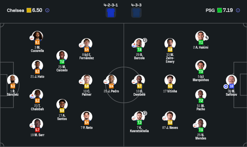 เปแอสเชในระบบ 4-3-3 เล่นได้ชัดเจนกว่า ทั้งการยืนตำแหน่ง การเปลี่ยนจากรับเป็นรุก และการโจมตีด้านข้าง ควารัตสเคเลียกับบาร์โคลาเล่นงานแนวรับเชลซีได้ต่อเนื่อง ส่วนแดนกลางจ่ายบอลแม่น คุมจังหวะนิ่ง ทำให้ภาพรวมทีมเยือนดูอันตรายทุกครั้งที่บุก
