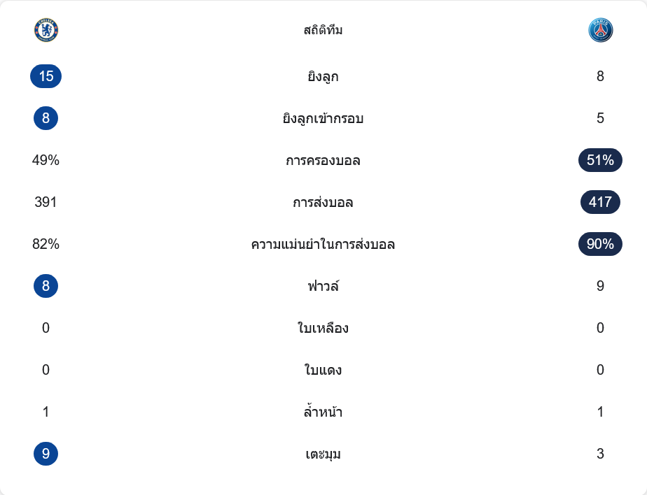 แม้เชลซีจะยิงมากกว่าที่ 15 ครั้ง เข้ากรอบ 8 ครั้ง และได้เตะมุมถึง 9 ครั้ง แต่เปแอสเชมีประสิทธิภาพสูงกว่าชัดเจน ทีมเยือนยิง 8 ครั้ง เข้ากรอบ 5 หน และเปลี่ยนเป็น 3 ประตู ครองบอล 51 เปอร์เซ็นต์ จ่ายบอล 417 ครั้ง ความแม่นยำ 90 เปอร์เซ็นต์ เหนือกว่าเชลซีที่จ่าย 391 ครั้ง แม่นยำ 82 เปอร์เซ็นต์ ทั้งสองทีมฟาวล์ใกล้เคียงกัน ไม่มีใบเหลืองและใบแดง แต่สิ่งที่ต่างคือความเฉียบคม นี่คือเกมที่ตัวเลขของ บ้านผลบอล บอกชัดว่าโอกาสมากกว่า ไม่ได้แปลว่าจะชนะเสมอไป