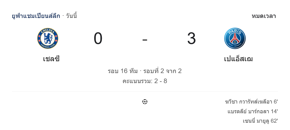 ศึก ยูฟ่า แชมเปี้ยนส์ ลีก รอบ 16 ทีม นัดที่สอง จบลงแบบเจ็บลึกสำหรับเชลซี หลังเปิดบ้านแพ้เปแอสเช 0-3 ส่งผลให้สกอร์รวมสองนัดขาดถึง 2-8 และเป็นทีมดังจากปารีสที่ผ่านเข้ารอบต่อไปอย่างเด็ดขาด คืนนี้ ผลบอลสด สะท้อนชัดว่าเชลซีมีจังหวะเข้าทำ แต่เปแอสเชคมกว่า นิ่งกว่า และลงโทษได้ทุกความผิดพลาด