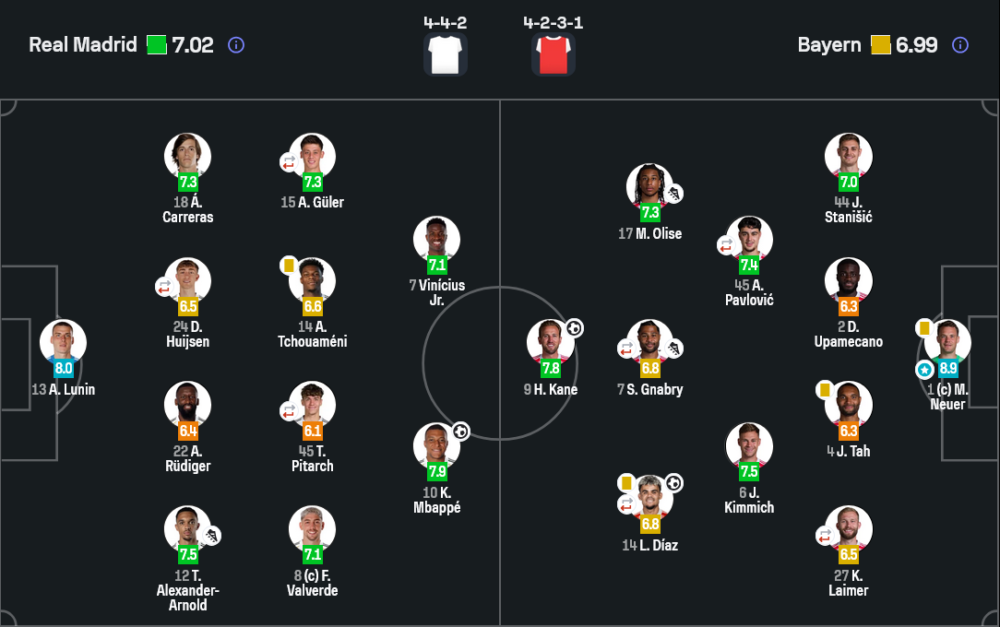 • กองกลาง : เฟเดริโก บัลเบร์เด 7.1, วินิซิอุส จูเนียร์ 7.1, คีลิยัน เอ็มบัปเป้ 7.9