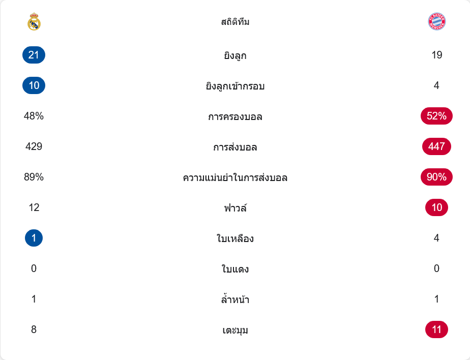 แม้ เรอัล มาดริด จะยิงมากกว่าถึง 21 ครั้ง และเข้ากรอบ 10 ครั้ง ขณะที่ บาเยิร์น ยิง 19 ครั้ง เข้ากรอบ 4 ครั้ง แต่ทีมเยือนเด็ดขาดกว่าในจังหวะทำประตู บาเยิร์นครองบอลมากกว่านิดหน่อยที่ 52 เปอร์เซ็นต์ ต่อ 48 เปอร์เซ็นต์ ผ่านบอล 447 ครั้ง ต่อ 429 ครั้ง และมีความแม่นยำในการจ่ายบอล 90 เปอร์เซ็นต์ ต่อ 89 เปอร์เซ็นต์ ส่วนลูกเตะมุม บาเยิร์นเหนือกว่าที่ 11 ต่อ 8 สะท้อนชัดว่าพวกเขาสร้างแรงกดดันได้ต่อเนื่องตลอดทั้งเกม
