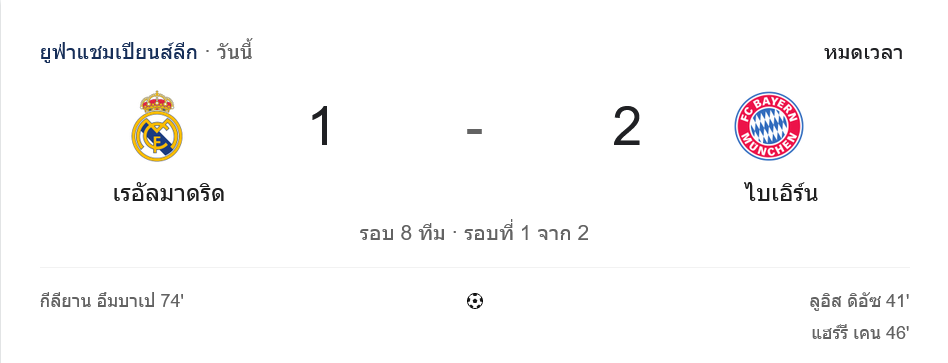 ช่วงท้ายเกมเจ้าบ้านโหมหนัก ทั้ง บราฮิม ดิอาซ, วินิซิอุส, มิลิเตา และเอ็มบัปเป้ มีโอกาสลุ้นต่อเนื่อง แต่ นอยเออร์ ยังยืนระยะเซฟสำคัญได้หมด สุดท้าย บาเยิร์นบุกมาคว้าชัย 2-1 กลับออกไป พร้อมกุมความได้เปรียบในเกมระดับ บ้านผลบอล ที่เข้มข้นแทบทุกนาที