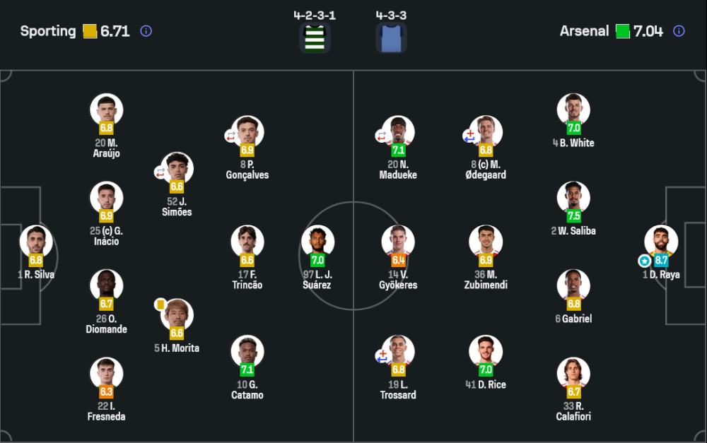 ดาบิด รายา คือหัวใจของชัยชนะในเกมนี้ ด้วยคะแนน 8.7 เซฟจังหวะสำคัญหลายครั้ง โดยเฉพาะช่วงท้ายเกมที่ช่วยให้อาร์เซนอลไม่เสียประตู ก่อนที่ทีมจะได้ประตูชัยในนาทีสุดท้าย