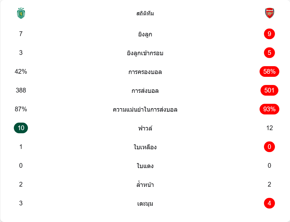 เกมนี้อาร์เซนอลเหนือกว่าชัดในเรื่องการครองบอลที่ 58 เปอร์เซ็นต์ พร้อมจำนวนการผ่านบอลมากถึง 501 ครั้ง และความแม่นยำสูงถึง 93 เปอร์เซ็นต์ ขณะที่สปอร์ติ้งมีโอกาสยิง 7 ครั้ง เข้ากรอบ 3 ส่วนอาร์เซนอลยิง 9 ครั้ง เข้ากรอบ 5 ถือว่าเป็นเกมที่ต่างฝ่ายต่างมีโอกาส แต่ทีมเยือนใช้โอกาสได้คุ้มค่ากว่า