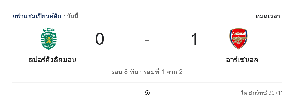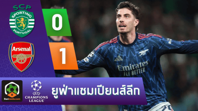 บ้านผลบอล สรุปหลังเกม ยูฟ่า แชมเปี้ยนส์ ลีก เดือดจนวินาทีบาป ฮาแวร์ตซ์ซัดนรกท้ายเกม พาอาร์เซนอลเชือดสปอร์ติ้ง ลิสบอน 1-0 กุมความได้เปรียบก่อนยกสอง