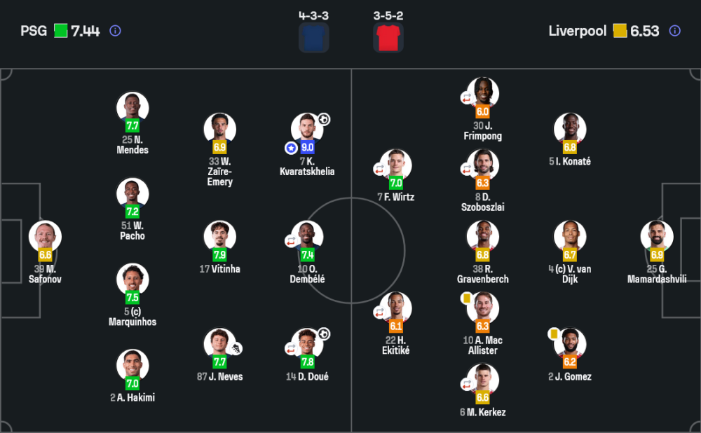 ควิชา ควารัตสเคเลีย รับตำแหน่งผู้เล่นยอดเยี่ยมของเกมแบบไร้ข้อกังขา หลังทำคะแนนสูงสุด 9.0 และเป็นตัวอันตรายที่สุดของเปแอสเชตลอดทั้งเกม เขายิงประตูสำคัญเป็น 2-0 ได้อย่างเฉียบคม แถมยังปั่นป่วนแนวรับลิเวอร์พูลด้วยการเลี้ยงกินตัวและหาพื้นที่เล่นได้ตลอดเวลา