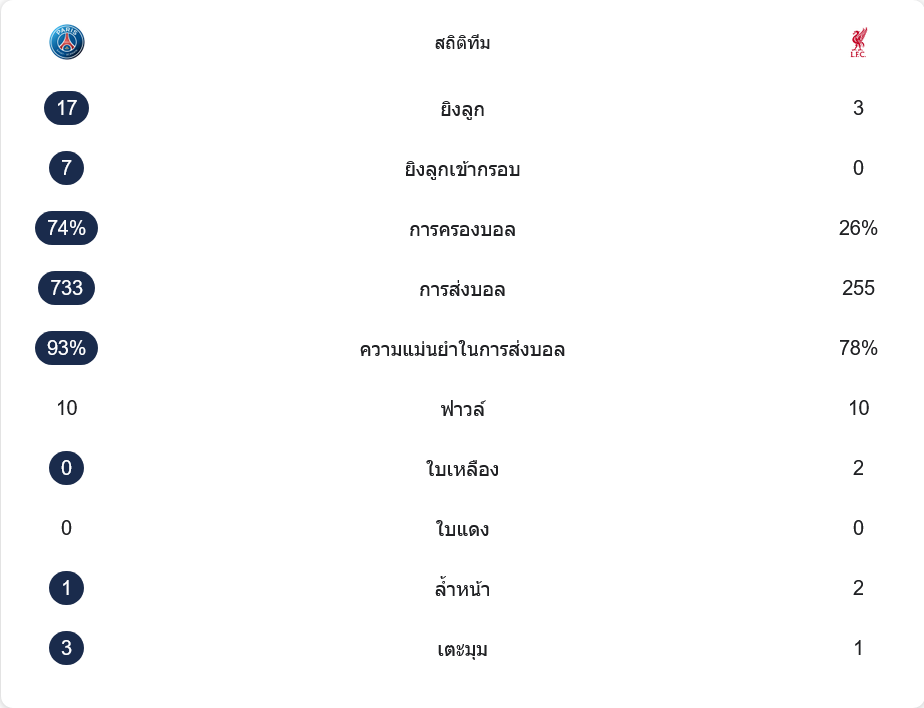 เกมนี้เปแอสเชเหนือกว่าชัดเจนทั้งในแง่สกอร์และตัวเลข พวกเขายิง 17 ครั้ง เข้ากรอบ 7 ครั้ง ขณะที่ลิเวอร์พูลยิงเพียง 3 ครั้งและไม่ตรงกรอบเลยแม้แต่หนเดียว เรื่องการครองบอลเจ้าถิ่นกินขาดที่ 74 เปอร์เซ็นต์ต่อ 26 เปอร์เซ็นต์ พร้อมจำนวนการจ่ายบอล 733 ต่อ 255 และความแม่นยำ 93 เปอร์เซ็นต์ต่อ 78 เปอร์เซ็นต์ ส่วนใบเหลือง ลิเวอร์พูลโดน 2 ใบ ขณะที่เปแอสเชไม่มีเลย ทำให้ภาพรวมของเกมนี้เป็นคืนที่ทีมจากปารีสคุมได้ทั้งหมด