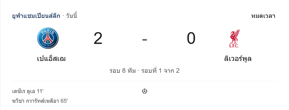 ศึก ยูฟ่า แชมเปี้ยนส์ ลีก รอบ 8 ทีม นัดแรก เกมนี้ เปแอสเช เปิดบ้านอัด ลิเวอร์พูล 2-0 แบบเหนือกว่าทั้งรูปเกมและจังหวะเข้าทำ โดย บ้านกีฬา มองว่านี่คือแมตช์ที่เจ้าถิ่นคุมทุกอย่างได้อยู่หมัด ขณะที่ฝั่งหงส์แดงแทบไม่มีคำตอบในเกมรุก และตัวเลข ผลบอลสด ก็สะท้อนชัดว่าใครเป็นฝ่ายครองสนาม