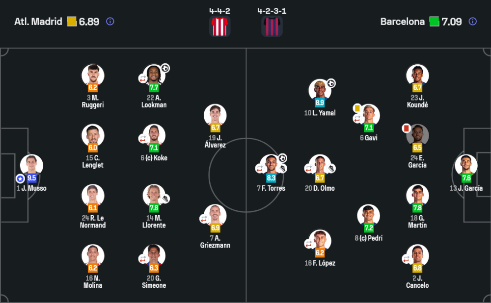 - กองหน้า : ลามีน ยามาล 8.9, ดานี่ โอลโม่ 6.7, เฟร์ราน ตอร์เรส 8.3