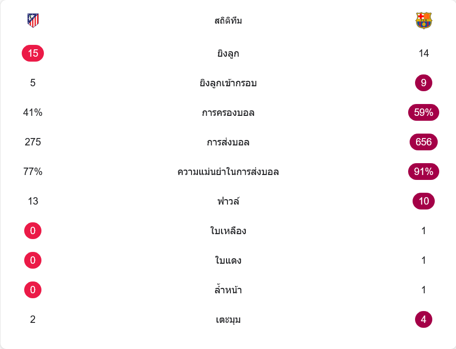 รูปเกมโดยรวมถือว่าสูสีและดุเดือด แอตเลติโกยิง 15 ครั้ง เข้ากรอบ 5 ครั้ง ส่วนบาร์เซโลนายิง 14 ครั้ง แต่เข้ากรอบถึง 9 ครั้ง ทีมเยือนครองบอล 59 เปอร์เซ็นต์ เหนือกว่าเจ้าถิ่นที่มี 41 เปอร์เซ็นต์ และจ่ายบอลมากถึง 656 ครั้งด้วยความแม่นยำ 91 เปอร์เซ็นต์ เทียบกับแอตเลติโกที่จ่าย 275 ครั้ง ความแม่นยำ 77 เปอร์เซ็นต์ ตัวเลขชัดเจนว่าบาร์ซ่าต่อบอลลื่นกว่า ขณะที่แอตเลติโกอาศัยความหนักและความเร็วในการสวนกลับ เกมนี้บาร์ซ่ามีใบเหลือง 1 ใบ ใบแดง 1 ใบ ส่วนเตะมุมทีมเยือนได้ 4 ครั้ง มากกว่าแอตเลติโกที่ได้ 2 ครั้ง