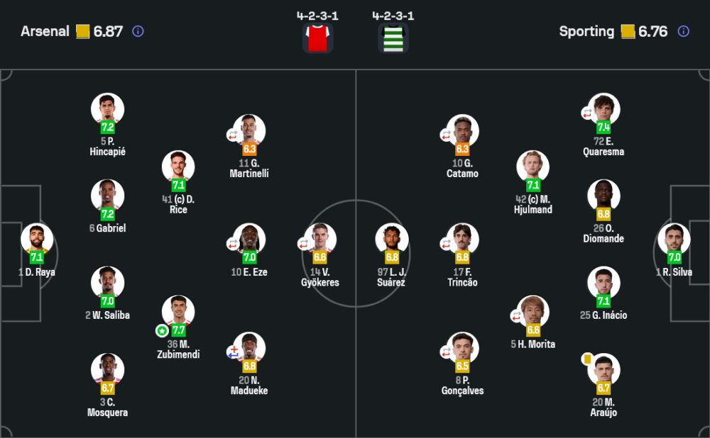 - เปลี่ยนตัว : ไค ฮาแวร์ตซ์ 6.7, แม็กซ์ ดาว์แมน 6.6, กาเบรียล เชซุส 6.5, เลอันโดร ทรอสซาร์ด 6.5, เกปา อาร์ริซาบาลากา, ทอมมี เซตฟอร์ด, เบน ไวต์, ไมลส์ ลูอิส สเคลลี, มาร์ลี แซลมอน, คริสเตียน นอร์การ์ด, แฮร์ริสัน ดัดเซียก