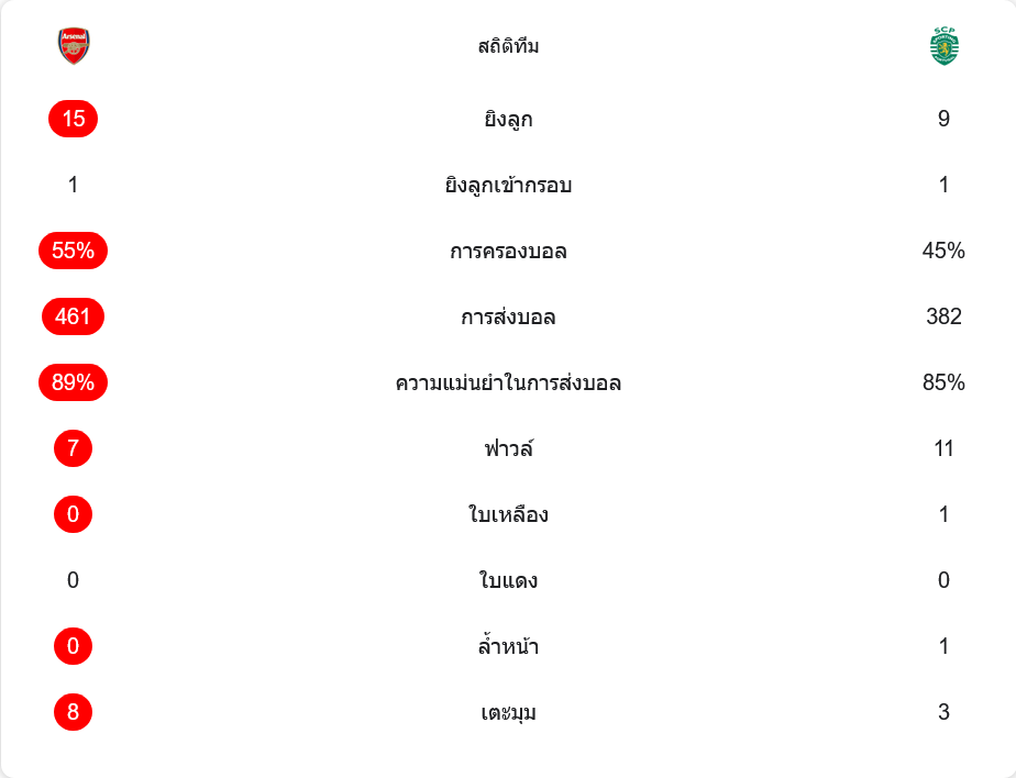อย่างไรก็ตาม จุดสำคัญคือทั้งสองทีมยิงเข้ากรอบได้เพียง 1 ครั้งเท่ากัน สะท้อนว่าจังหวะสุดท้ายยังไม่เฉียบขาดพอ โดยสปอร์ติ้งทำฟาวล์มากกว่า 11 ครั้ง และโดนใบเหลือง 1 ใบ ขณะที่อาร์เซนอลไม่มีใบเหลืองเลย