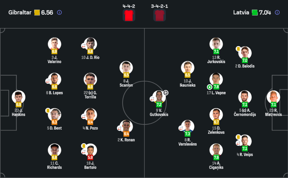 ยิบรอลตาร์มาในระบบ 4-4-2 เน้นความแน่นและวินัยเป็นหลัก พวกเขารับลึก วางบล็อกสองชั้น และพยายามใช้เกมสวนกลับเล่นงานลัตเวีย จุดแข็งคือการยืนตำแหน่งในครึ่งแรกที่ค่อนข้างมีระเบียบ ทำให้คู่แข่งเจาะตรงกลางไม่ง่าย