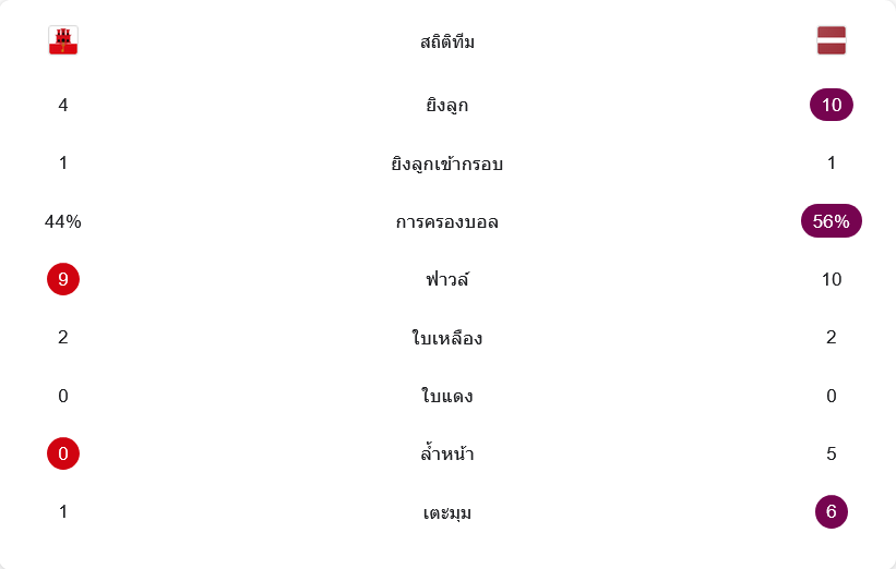 จุดสำคัญคือเกมรับของลัตเวียก็ไม่เสียทรงง่าย แม้ยิบรอลตาร์จะมีช่วงบุกกลับมาบ้าง แต่ทีมเยือนยังคุมพื้นที่อันตรายได้ดี ภาพรวมจึงเป็นเกมที่ลัตเวียเหนือกว่าทั้งจังหวะบุก การต่อบอล และความเด็ดขาดในพื้นที่สุดท้าย