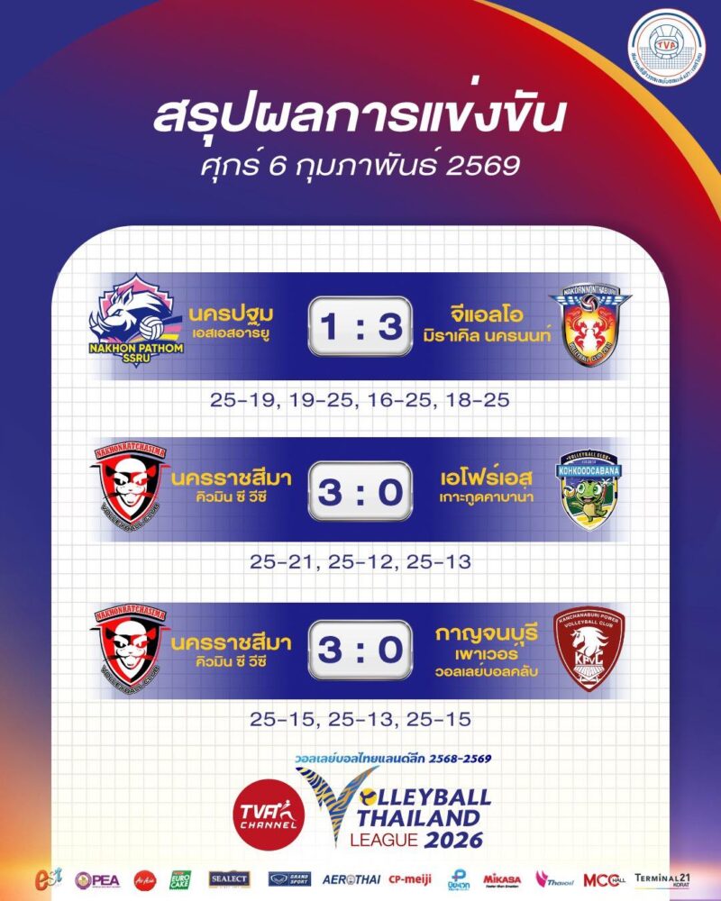 สรุปผลวอลเลย์บอลไทยแลนด์ลีก 2026 เดือดวันศุกร์ นครปฐมพ่าย 1-3 ส่วนโคราชกวาดสองแมตช์รวดแบบไม่ให้หายใจ!