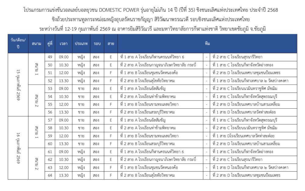 🗓โปรแกรมแข่งขันวันที่ 15 ก.พ. 2569