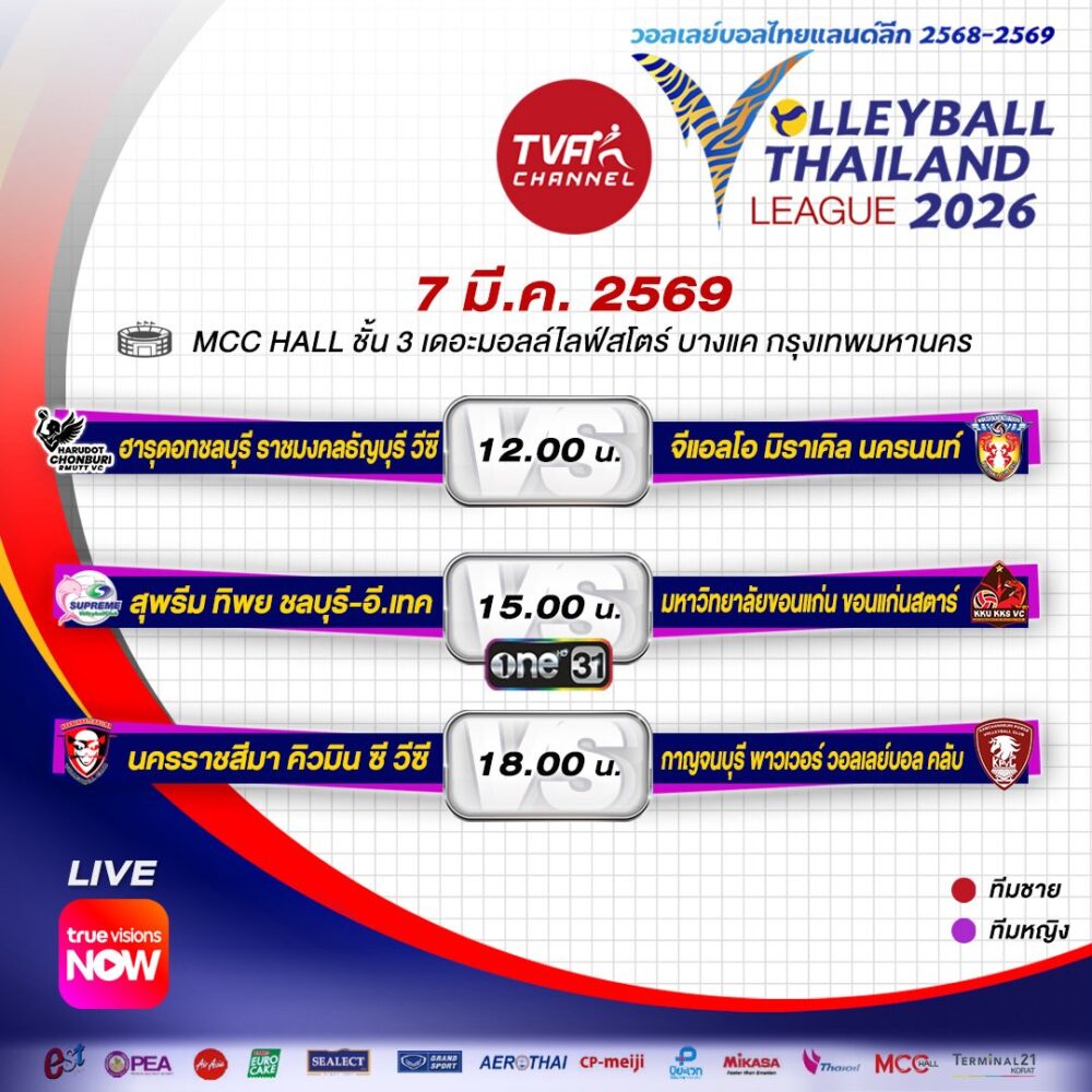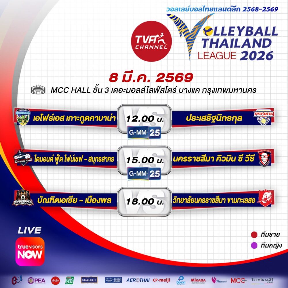 โปรแกรมแข่ง วอลเลย์บอลไทยแลนด์ลีก 2026 สัปดาห์ที่ 8