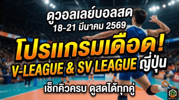 โปรแกรมรอบนี้มีครบทั้ง V-League และ SV League ญี่ปุ่น ทั้งชายและหญิง โดยไล่ตั้งแต่ 18 มีนาคม ไปจนถึง 21 มีนาคม 2569 ใครเป็นสายดูสดควรล็อกเวลาไว้ล่วงหน้า โดยเฉพาะเกมจากญี่ปุ่นที่เตะช่วงสายถึงเที่ยง เหมาะกับแฟนกีฬาไทยที่อยากเปิดจอเชียร์แบบต่อเนื่อง