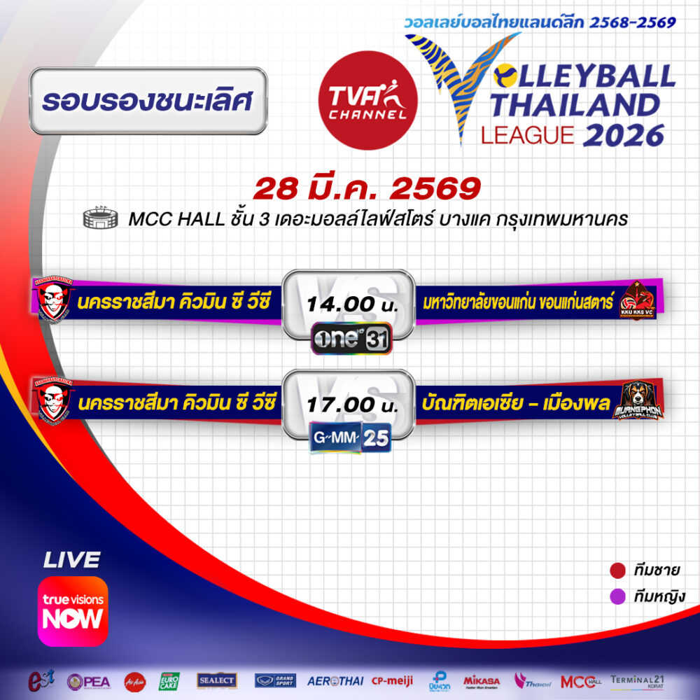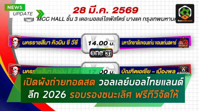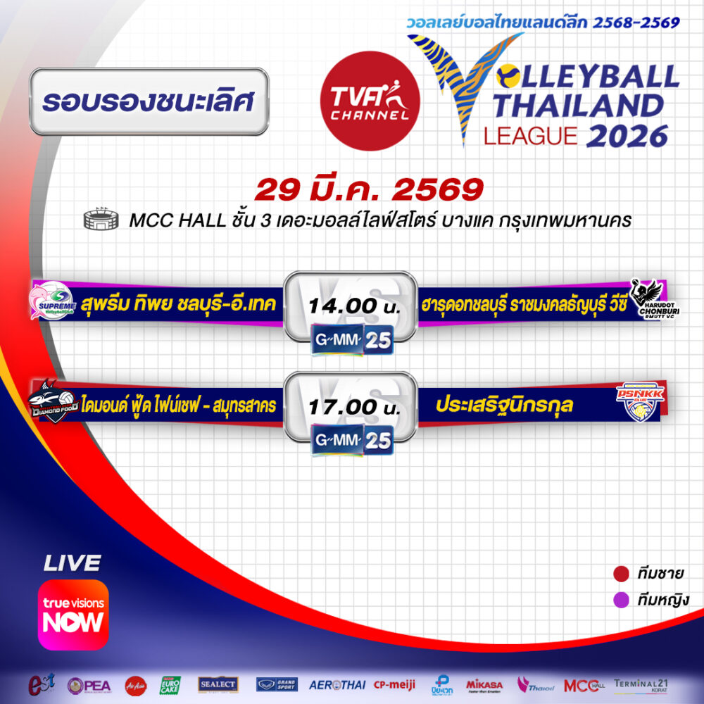 แฟนกีฬาที่ไม่ได้ไปเชียร์ถึงสนามไม่ต้องเสียดาย เพราะโปรแกรม วอลเลย์บอลไทยแลนด์ลีก 2026 รอบรองชนะเลิศออกมาแล้วเรียบร้อย พร้อมถ่ายทอดสดครบทุกคู่ให้ตามกันแบบจุใจจาก MCC HALL ชั้น 3 เดอะมอลล์ไลฟ์สโตร์ บางแค กรุงเทพมหานคร