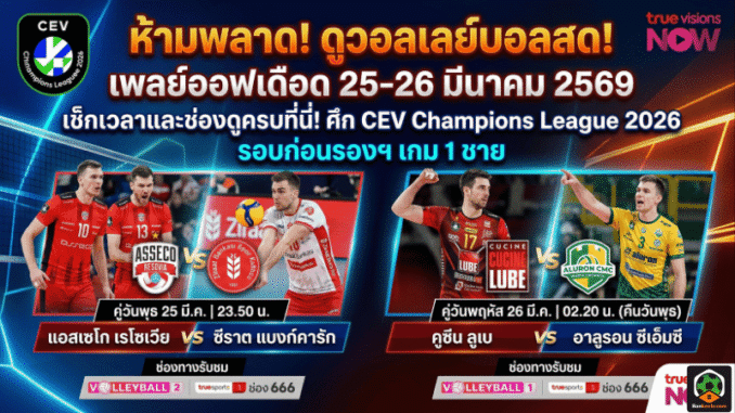 | วันพฤหัสบดี 26 มีนาคม 2569 (คืนวันพุธ) | 02.20 น. | คูซีน ลูเบ ชีวิตาโนวา พบ อาลูรอน ซีเอ็มซี วาร์ตา ซาเวียร์เช | Volleyball 1, True Sports 1 ช่อง 666, BANKEELA |