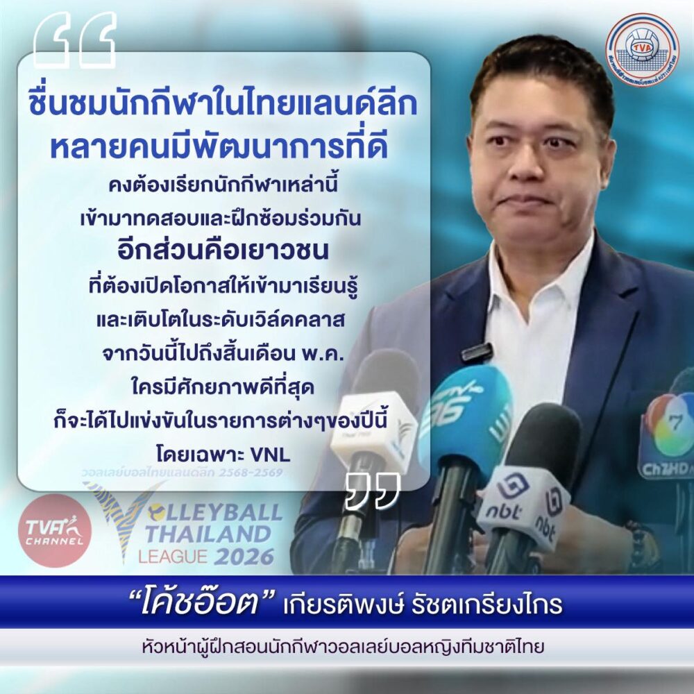 “ชื่นชมนักกีฬาในไทยแลนด์ลีก หลายคนมีพัฒนาการที่ดี คงต้องเรียกนักกีฬาเหล่านี้เข้ามาทดสอบและฝึกซ้อมร่วมกัน อีกส่วนคือเยาวชน ที่ต้องเปิดโอกาสให้เข้ามาเรียนรู้ และเติบโตในระดับเวิล์ดคลาส จากวันนี้ไปถึงสิ้นเดือน พ.ค. ใครมีศักยภาพดีที่สุด ก็จะได้ไปแข่งขันในรายการต่างๆของปีนี้ โดยเฉพาะ VNL”