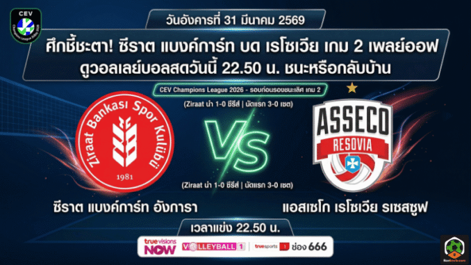 ซีราต แบงค์การ์ท อังการา vs แอสเซโก เรโซเวีย รเซสซูฟอังคาร 31 มีนาคม 256922.50 น.CEV Champions League 2026 รอบก่อนรองชนะเลิศ ชาย เกม 2Volleyball 1, True Sports 1 ช่อง 666, TrueVisions NOW, BANKEELA