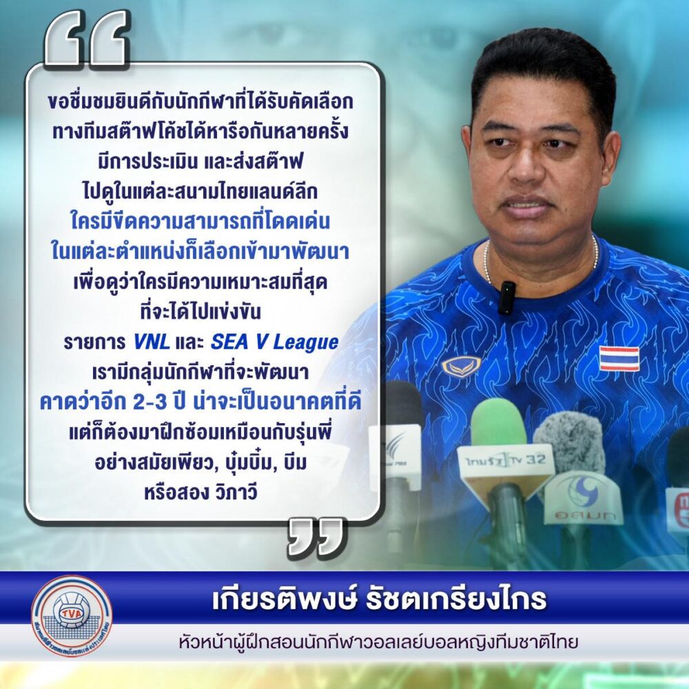 “ขอชื่นชมยินดีกับนักกีฬาที่ได้รับคัดเลือก ทางทีมสต๊าฟโค้ชได้หารือกันหลายครั้ง มีการประเมิน และส่งสต๊าฟไปดูในแต่ละสนามไทยแลนด์ลีก ใครมีขีดความสามารถที่โดดเด่นในแต่ละตำแหน่งก็เลือกเข้ามาพัฒนา เพื่อดูว่าใครมีความเหมาะสมที่สุดที่จะได้ไปแข่งขันรายการ VNL และ SEA V League เรามีกลุ่มนักกีฬาที่จะพัฒนา คาดว่าอีก 2-3 ปี น่าจะเป็นอนาคตที่ดี แต่ก็ต้องมาฝึกซ้อมเหมือนกับรุ่นพี่ อย่างสมัยเพียว, บุ๋มบิ๋ม, บีม หรือสอง วิภาวี”