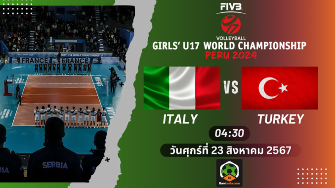 ถ่ายทอดสด วอลเลย์บอลวันนี้ อิตาลี VS ตุรกี ในการแข่งขัน (FIVB Volleyball Girls’ U17 World Championship) ระหว่างวันที่ 17-23 สิงหาคม 2567 ซึ่งจะจัดขึ้นที่ประเทศเปรู