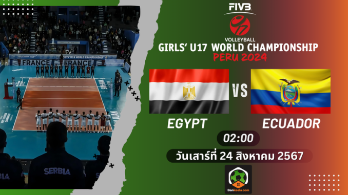 ถ่ายทอดสด วอลเลย์บอลวันนี้ อียิปต์ VS เอกวาดอร์ ในการแข่งขัน (FIVB Volleyball Girls’ U17 World Championship) ระหว่างวันที่ 17-23 สิงหาคม 2567 ซึ่งจะจัดขึ้นที่ประเทศเปรู