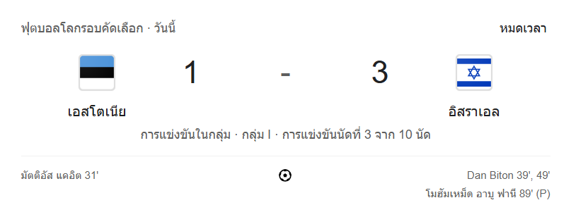 - หมดเวลาการแข่งขัน: เอสโตเนีย 1-3 อิสราเอล