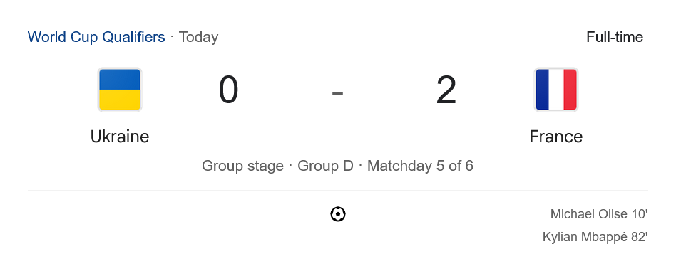 จาก : ผลบอลสด ฟุตบอลโลก 2026 รอบคัดเลือก โซนยุโรป กลุ่ม D ระหว่าง ยูเครน 0-2 ฝรั่งเศส วันนี้ 6/9/68 – บ้านกีฬา