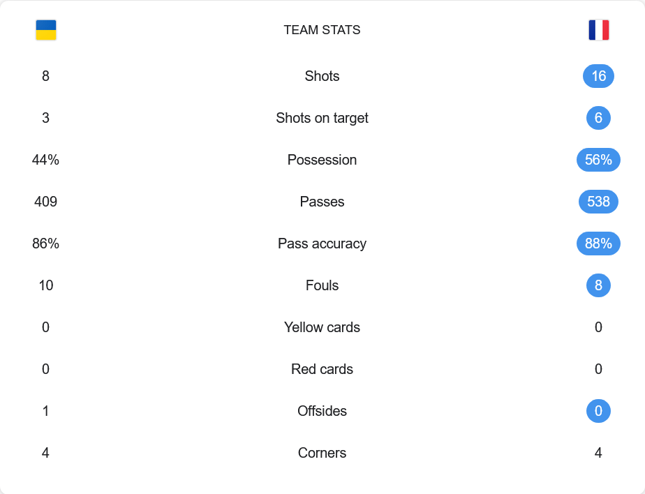 ตลอดเกมฝรั่งเศสครองบอลมากกว่าเล็กน้อยที่ 56% ต่อ 44% ของยูเครน จ่ายบอลทั้งทีม 538 ครั้ง ความแม่นยำ 88% ขณะที่เจ้าถิ่นจ่าย 409 ครั้ง แม่นยำ 86% โอกาสยิงฝรั่งเศส 16 ครั้ง เข้ากรอบ 6 ส่วนยูเครนมี 8 ครั้ง เข้ากรอบ 3 ตัวเลขฟาวล์ค่อนข้างใกล้กัน 8 ต่อ 10 ไม่มีใบเหลืองหรือใบแดงให้ลุ้น นอกนั้นลูกเตะมุมเท่ากัน 4-4 และล้ำหน้าเป็นยูเครน 1 ครั้ง ฝรั่งเศส 0