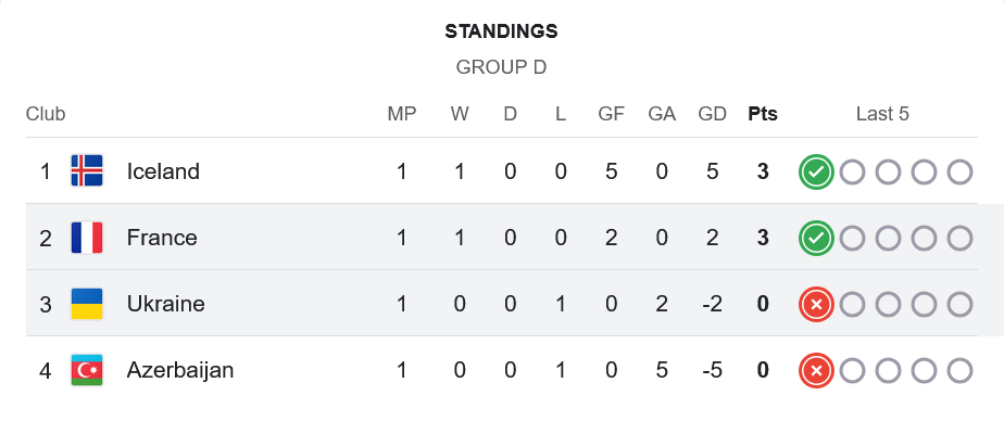 จบแมตช์เดย์แรกของกลุ่ม D ไอซ์แลนด์ถล่มอาเซอร์ไบจาน 5-0 นำฝูงด้วยผลต่างประตูได้เสีย +5 ฝรั่งเศสเก็บ 3 แต้มเท่ากันรั้งที่ 2 ด้วยผลต่าง +2 ยูเครนยังไร้แต้มอยู่อันดับ 3 ผลต่าง -2 และอาเซอร์ไบจานบ๊วย -5 เกมนี้ทำให้เส้นทางของฝรั่งเศสดูสดใสตั้งแต่เริ่ม ส่วนยูเครนต้องเร่งเครื่องในสองนัดถัดไปเพื่อกลับมาลุ้นพื้นที่หัวตาราง บ้านผลบอล มองว่าผลต่างประตูอาจเป็นตัวตัดสินสำคัญเมื่อเข้าช่วงโค้งสุดท้าย