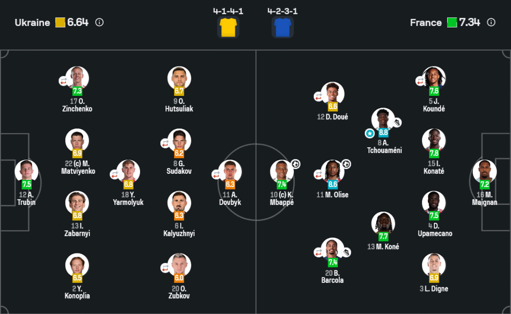 เซร์ฮีย์ เรบรอฟแก้หมากด้วยการเสริมรุกหลายจุด แต่แดนกลางฝรั่งเศสที่มี ออเรลียง ชูอาเมนี เป็นแกนหลักคุมเทมโปและตัดเกมได้อยู่หมัด นาที 46 ดีดีเย่ร์ เดส์ชองส์ส่ง อุสมาน เดมเบเล ลงมาทำให้เกมริมเส้นจัดจ้านขึ้นเรื่อยๆ ยูเครนมีจังหวะหวาดเสียวจากดอฟบิคก่อนถูกถอด นาที 82 ไคเลียน เอ็มบัปเป้ กัปตันทีม ลากแหวกแนวรับแล้วไหลคืนให้ชูอาเมนี ปั่นโค้งเสียบเสาไกล งามหยดเป็น 2-0 ช่วงท้ายเจ้าถิ่นลุยหนักแต่ติดเซฟอนาโตลี ทรูบินของตัวเองหลายครั้ง ทำให้สกอร์คงเดิม ฝรั่งเศสปิดเกมแบบเด็ดขาด