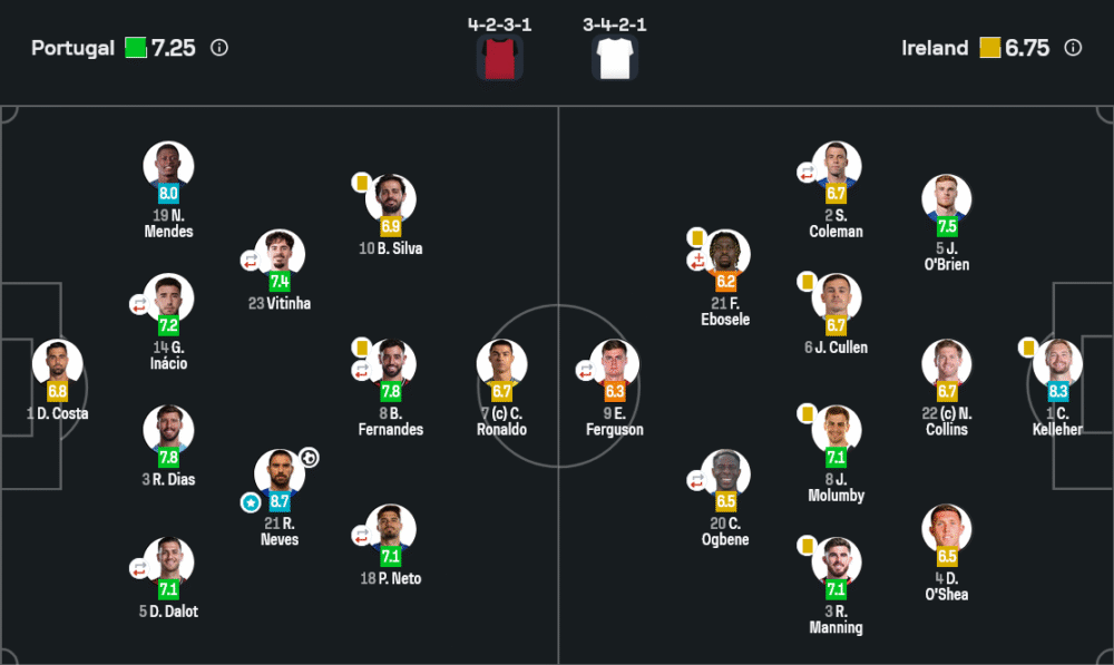 ตลอด 90 นาที โปรตุเกสยิงทั้งหมด 30 ครั้ง เข้ากรอบ 6 ครั้ง ครองบอลถึง 70% และส่งบอลมากถึง 674 ครั้ง ขณะที่ไอร์แลนด์ได้ยิงเพียง 2 ครั้งเท่านั้น ครองบอลเพียง 30% มีใบเหลืองถึง 5 ใบจากเกมรับที่ต้องตัดเกมบ่อยครั้ง ส่วนโปรตุเกสได้ไป 2 ใบ เห็นได้ชัดว่าฝอยทองเหนือกว่าอย่างสิ้นเชิงทั้งรูปเกมและจังหวะจบสกอร์