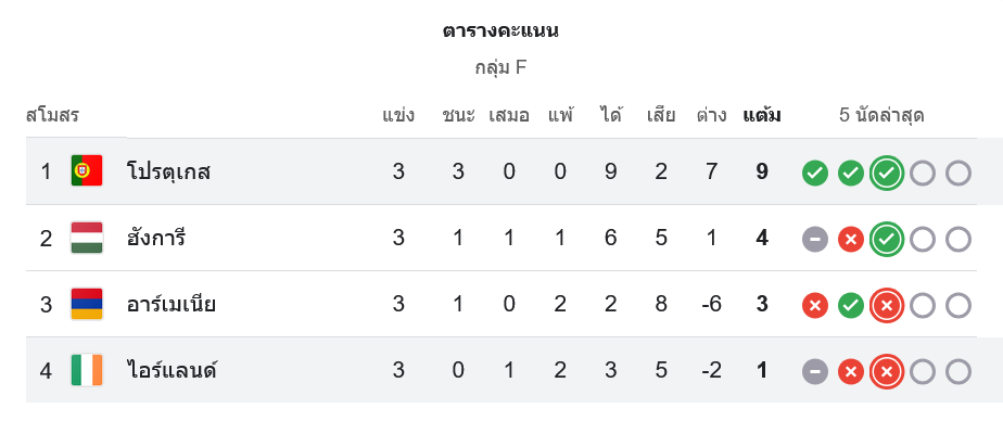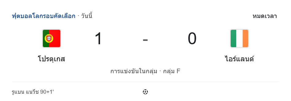 ศึก ฟุตบอลโลก รอบคัดเลือก โซนยุโรป กลุ่ม F ที่สนามเอสตาดิโอ อัลการ์ฟ เมื่อคืนที่ผ่านมา แฟนๆ ที่ติดตาม ผลบอลสด ต้องลุ้นกันจนวินาทีสุดท้าย เมื่อ โปรตุเกส ภายใต้การคุมทีมของโรแบร์โต้ มาร์ติเนซ เฉือนเอาชนะ ไอร์แลนด์ ไปอย่างระทึกใจ 1-0 จากประตูชัยของ รูเบน เนเวส ในนาที 90+1 ส่งให้ทัพฝอยทองเก็บ 3 แต้มเต็ม นำโด่งเป็นจ่าฝูงของกลุ่มต่อเนื่อง