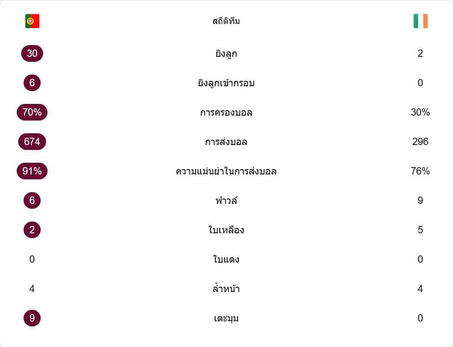 หากมองในแง่ วิเคราะห์บอล เกมนี้ชัดเจนว่า โปรตุเกสเหนือกว่าทุกมิติ ทั้งการครองบอล 70% และการส่งบอลแม่นยำถึง 91% รูปแบบการเล่น 4-2-3-1 ของมาร์ติเนซเน้นบุกจากด้านข้างโดยใช้ฟูลแบ็กอย่างดาโลต์และเมนเดสเติมสูงตลอด ขณะที่ไอร์แลนด์มาในระบบ 3-4-2-1 ตั้งรับลึกและเน้นสวนกลับ แต่ขาดความคมในพื้นที่สุดท้าย เกมรับของพวกเขาถือว่าเหนียวแน่นมากจนเกือบหยุดได้สำเร็จ แต่สุดท้ายก็มาเสียสมาธิในช่วงทดเจ็บให้เนเวสลงโทษอย่างเด็ดขาด