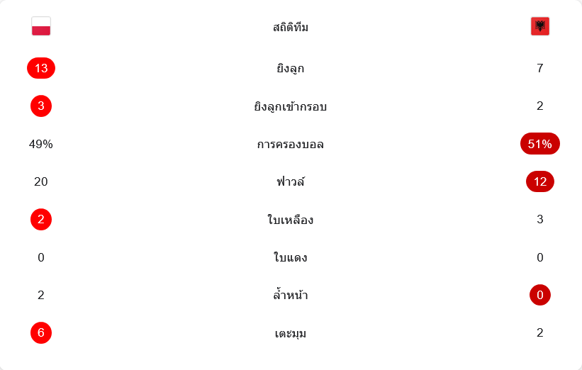 ด้านเกมรับและวินัย แอลเบเนียทำฟาวล์ 12 ครั้ง ส่วนโปแลนด์ฟาวล์ 20 ครั้ง ใบเหลืองของโปแลนด์มี 2 ใบ ขณะที่แอลเบเนียโดน 3 ใบ และอีกจุดที่เห็นชัดคือโปแลนด์ได้เตะมุม 6 ครั้ง มากกว่าแอลเบเนียที่ได้เพียง 2 ครั้ง สะท้อนว่าทีมเจ้าถิ่นกดเกมรุกในพื้นที่สุดท้ายได้ต่อเนื่องกว่า
