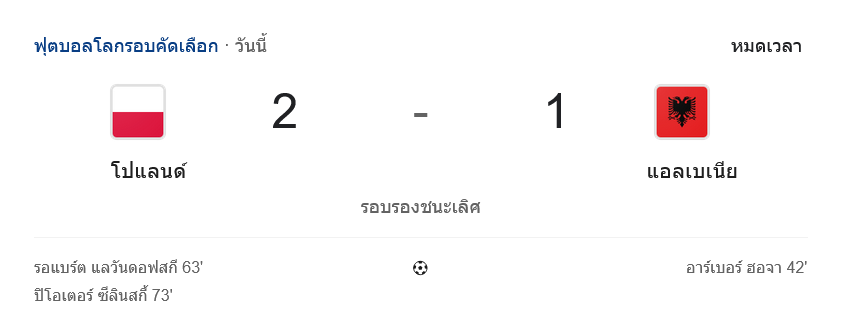 จาก : ผลบอลสด ฟุตบอลโลก 2026 รอบคัดเลือก โซนยุโรป ระหว่าง โปแลนด์ 2-1 แอลเบเนีย วันนี้ 27/3/69 – บ้านกีฬา