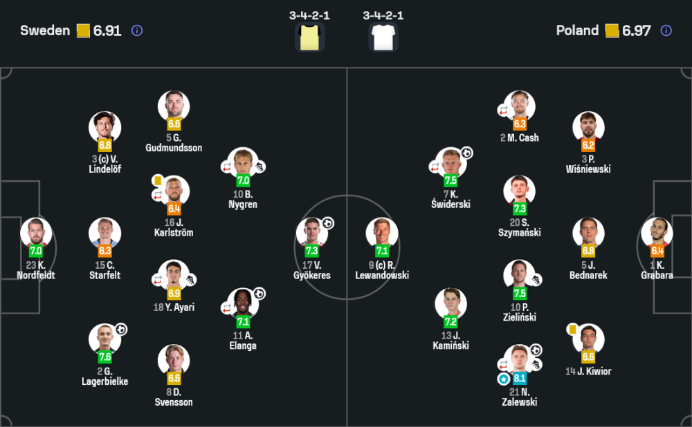 แม้โปแลนด์จะเป็นฝ่ายแพ้ แต่ นิโคลา ซาเลฟสกี คือผู้เล่นที่เด่นที่สุดในสนามด้วยคะแนน 8.1 เขายิง 1 ประตู ทำ 1 แอสซิสต์ และสร้างปัญหาให้แนวรับสวีเดนตลอดเกม ความเร็ว ความคล่อง และการตัดสินใจในพื้นที่สุดท้ายของเขาคือหัวใจสำคัญที่ทำให้โปแลนด์มีลุ้นจนถึงช่วงท้าย