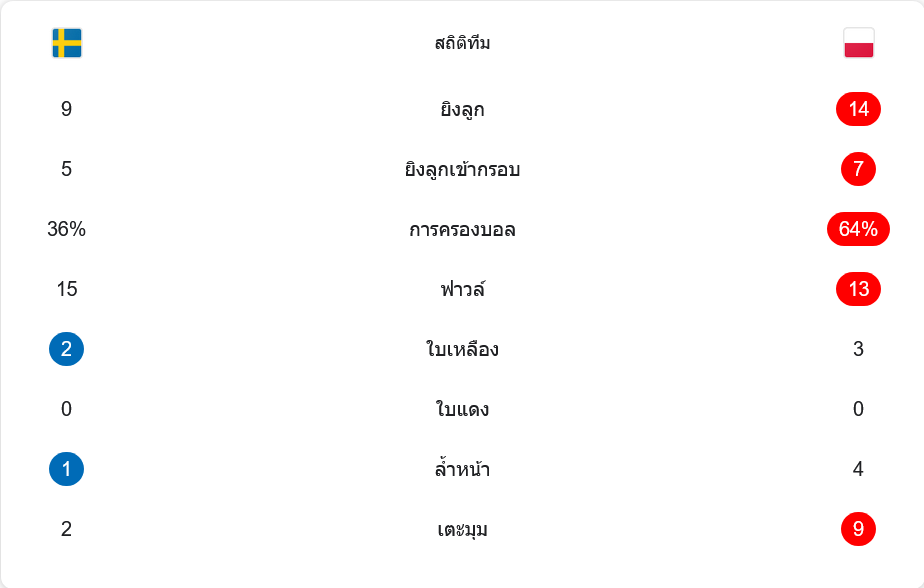แม้โปแลนด์จะดูเหนือกว่าในเชิงตัวเลข ด้วยการยิง 14 ครั้ง เข้ากรอบ 7 ครั้ง และครองบอล 64 เปอร์เซ็นต์ ขณะที่สวีเดนยิง 9 ครั้ง เข้ากรอบ 5 ครั้ง และครองบอล 36 เปอร์เซ็นต์ แต่สิ่งที่ต่างกันคือความเด็ดขาดในจังหวะจบสกอร์ โปแลนด์ได้เตะมุมมากถึง 9 ครั้ง ส่วนสวีเดนได้เพียง 2 ครั้ง เกมนี้สวีเดนทำฟาวล์ 15 ครั้ง โปแลนด์ 13 ครั้ง ทั้งสองทีมไม่มีใบแดง โดยสวีเดนได้ 2 ใบเหลือง และโปแลนด์ 3 ใบเหลือง ภาพรวมจึงเป็นเกมที่โปแลนด์มีปริมาณ แต่สวีเดนมีคุณภาพมากกว่า