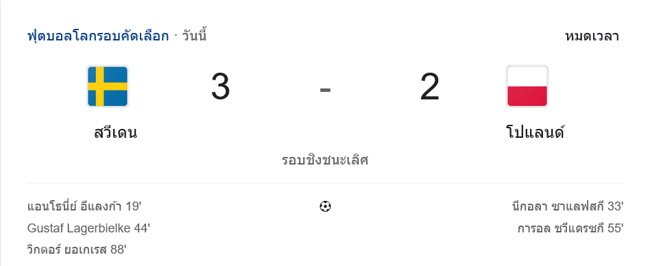- 🔁 นาที 81 สวีเดนเปลี่ยนตัว กุสตาฟ ลุนด์เกรน ลงแทน เบนยามิน นือเกรน